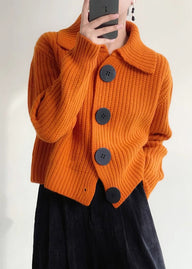 Bring a pop of seasonal style to your wardrobe with this women’s knit cardigan in a vibrant orange shade. Featuring a distinctive Peter Pan collar, button-down front, and soft blended knit, it combines playful detailing with classic comfort. Its cropped length and loose fit make it perfect for layering over dresses, tops, or turtlenecks during the cooler months.